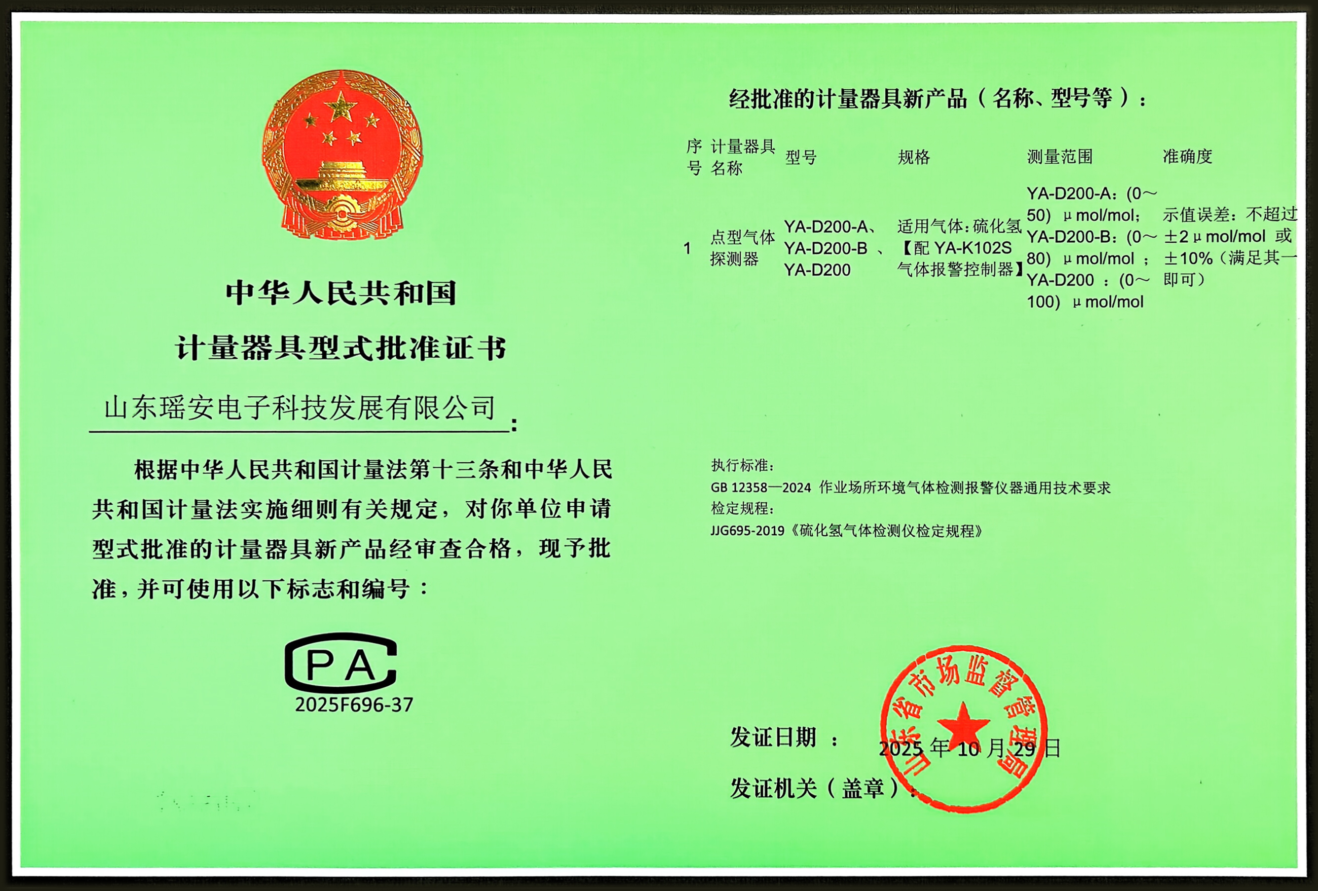YA-D200 点型气体探测器 硫化氢 计量器具型式批准证书
